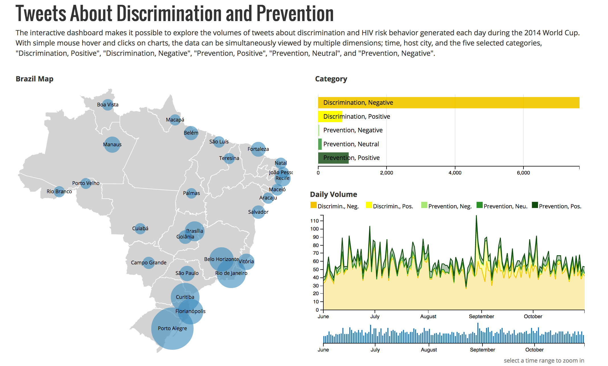 The objective of this project is to support programmatic activities on HIV in Brazil including the Zero Discrimination Campaign, by showcasing insights and documenting lessons learned from using social media in this particular development area. Social media data is being explored in the 2 following ways: